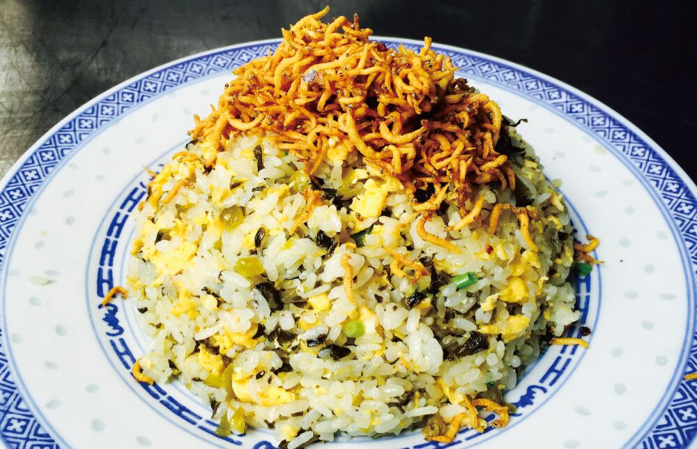 手間暇かけて作る孔雀樓のこだわりチャーハンです。チャーハンの上には揚げシラスがたっぷり。手間がかかるため、店頭での通常販売は終売していますが、知る人ぞ知る逸品が冷凍限定で復活しました。